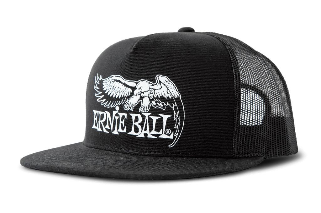 Show your Ernie Ball pride with this classic Ernie Ball Eagle logo cap. Adjustable, classic snap-back design. Screen printed logo on cotton trucker cap front. Logo color matches cap color.