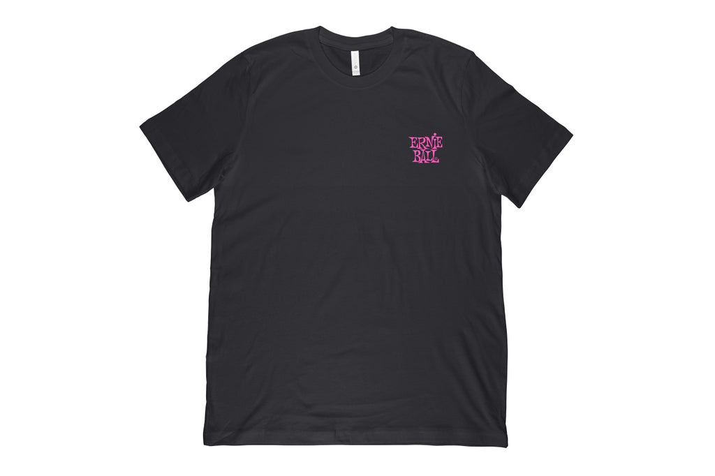 Cheat Death with this ripping Slinky graphic! Featuring our classic Ernie Ball stack logo on the left chest with a full shred fest on the back. Screen printed white/pink ink on black poly cotton jersey t-shirt. 65% polyester, 35% combed ring-spun cotton, 3.5oz fabric.
