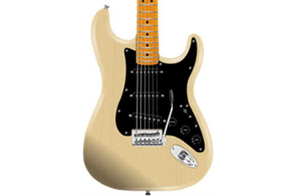 • Bridge: 2-Point Synchronized Tremolo with Bent Steel Saddles, Pop-In Tremolo Arm and Cold-Rolled Steel Block